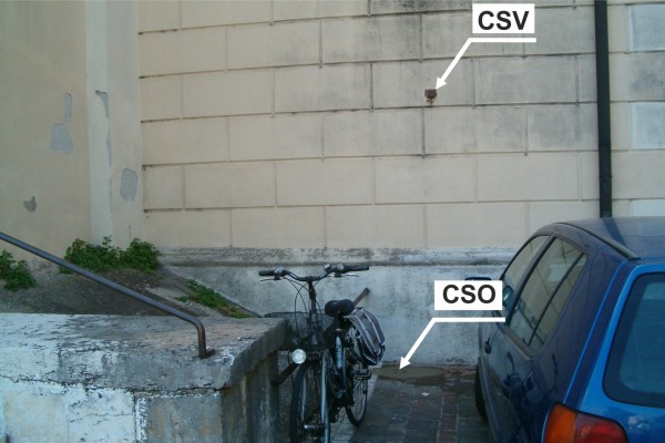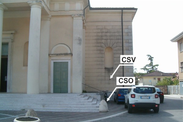 | Contrassegni | [{"simbolo_contrassegno":"P3","materializzazione":"(CSO) – Chiusino di III categoria , rialzato con tubo in PVC e protetto da tappo in ghisa, interrato alla base della facciata della chiesa, nell'angolo di destra della gradinata d'accesso. Alto non misurabile perch\u00e9 coperto dalla pavimentazione."},{"simbolo_contrassegno":"V1","materializzazione":"(CSV) – Mensola IGM infissa sulla facciata suddetta, in corrispondenza del CSO."}] |