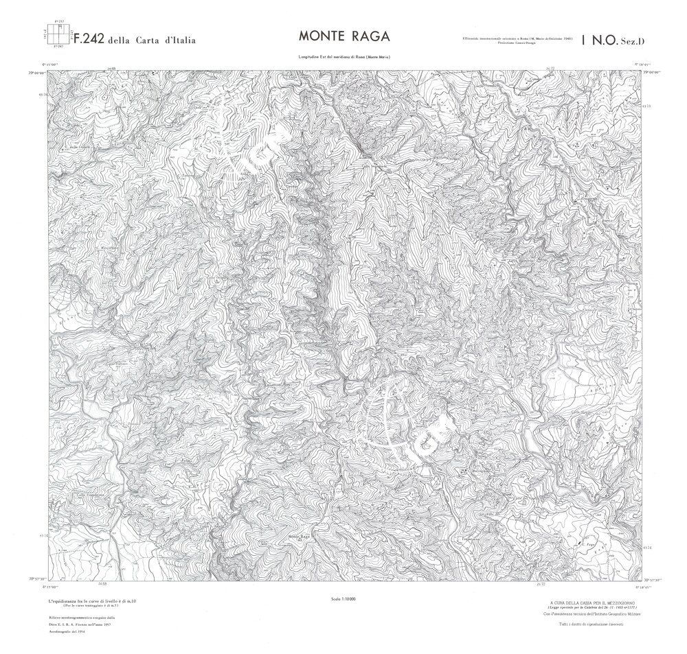 Rilievo eseguito da ditte private a cura della Cassa per il Mezzogiorno (legge speciale per la Calabria 26/11/1955 n°1177) con l’assistenza tecnica dell’ I.G.M. Rilievo aereofotogrammetrico,proiezione naturale,stampa in nero,equidistanza tra le curve mt.10. Le fotoriprese aeree furono eseguite nel 1954, l’elemento cartografico era la sezione di tavoletta, ossia 1/4 di tavoletta, distinta dalle lettere A;B;C;D.