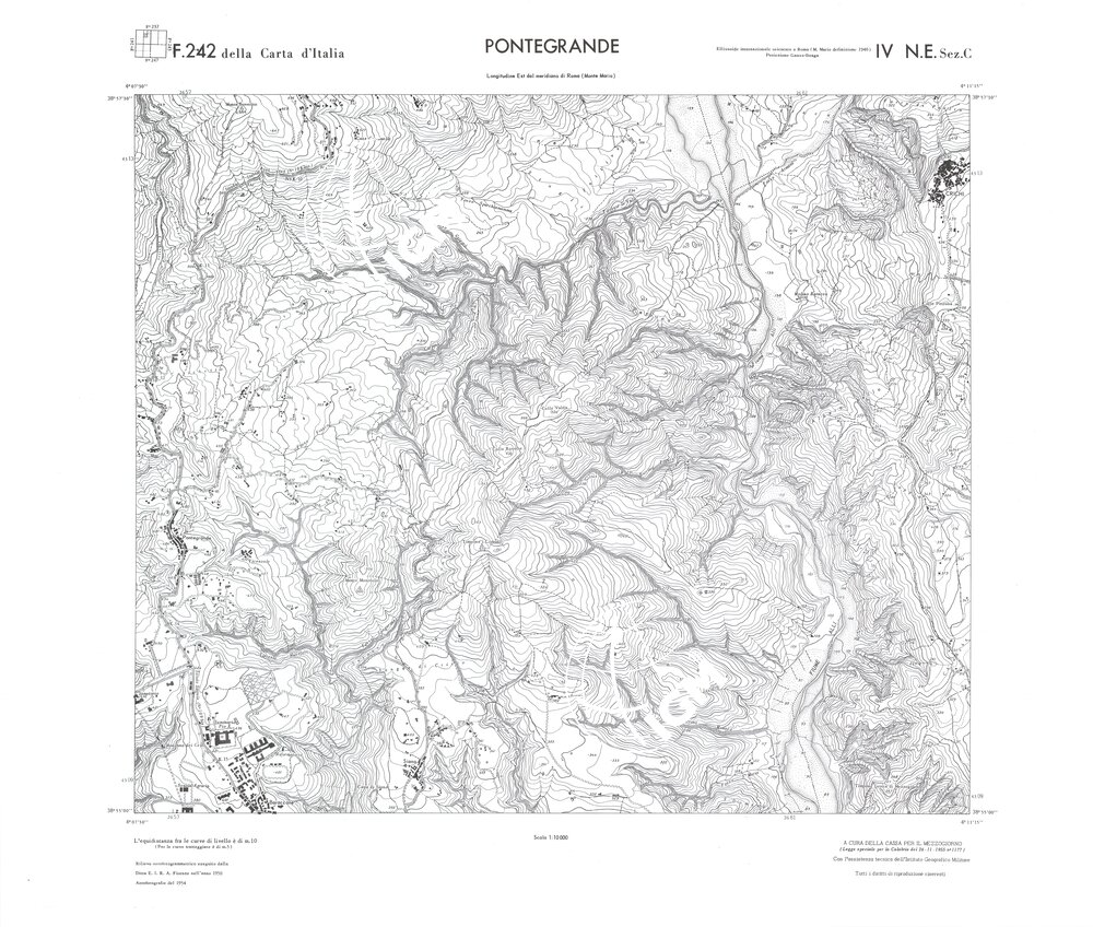 Rilievo eseguito da ditte private a cura della Cassa per il Mezzogiorno (legge speciale per la Calabria 26/11/1955 n°1177) con l’assistenza tecnica dell’ I.G.M. Rilievo aereofotogrammetrico,proiezione naturale,stampa in nero,equidistanza tra le curve mt.10. Le fotoriprese aeree furono eseguite nel 1954, l’elemento cartografico era la sezione di tavoletta, ossia 1/4 di tavoletta, distinta dalle lettere A;B;C;D.