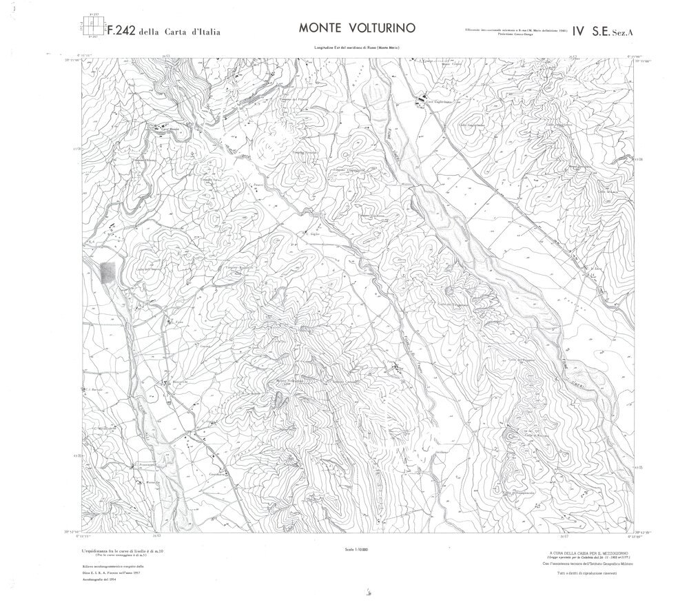 Rilievo eseguito da ditte private a cura della Cassa per il Mezzogiorno (legge speciale per la Calabria 26/11/1955 n°1177) con l’assistenza tecnica dell’ I.G.M. Rilievo aereofotogrammetrico,proiezione naturale,stampa in nero,equidistanza tra le curve mt.10. Le fotoriprese aeree furono eseguite nel 1954, l’elemento cartografico era la sezione di tavoletta, ossia 1/4 di tavoletta, distinta dalle lettere A;B;C;D.
