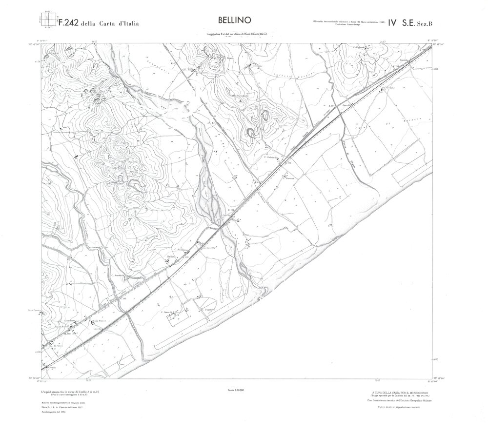 Rilievo eseguito da ditte private a cura della Cassa per il Mezzogiorno (legge speciale per la Calabria 26/11/1955 n°1177) con l’assistenza tecnica dell’ I.G.M. Rilievo aereofotogrammetrico,proiezione naturale,stampa in nero,equidistanza tra le curve mt.10. Le fotoriprese aeree furono eseguite nel 1954, l’elemento cartografico era la sezione di tavoletta, ossia 1/4 di tavoletta, distinta dalle lettere A;B;C;D.