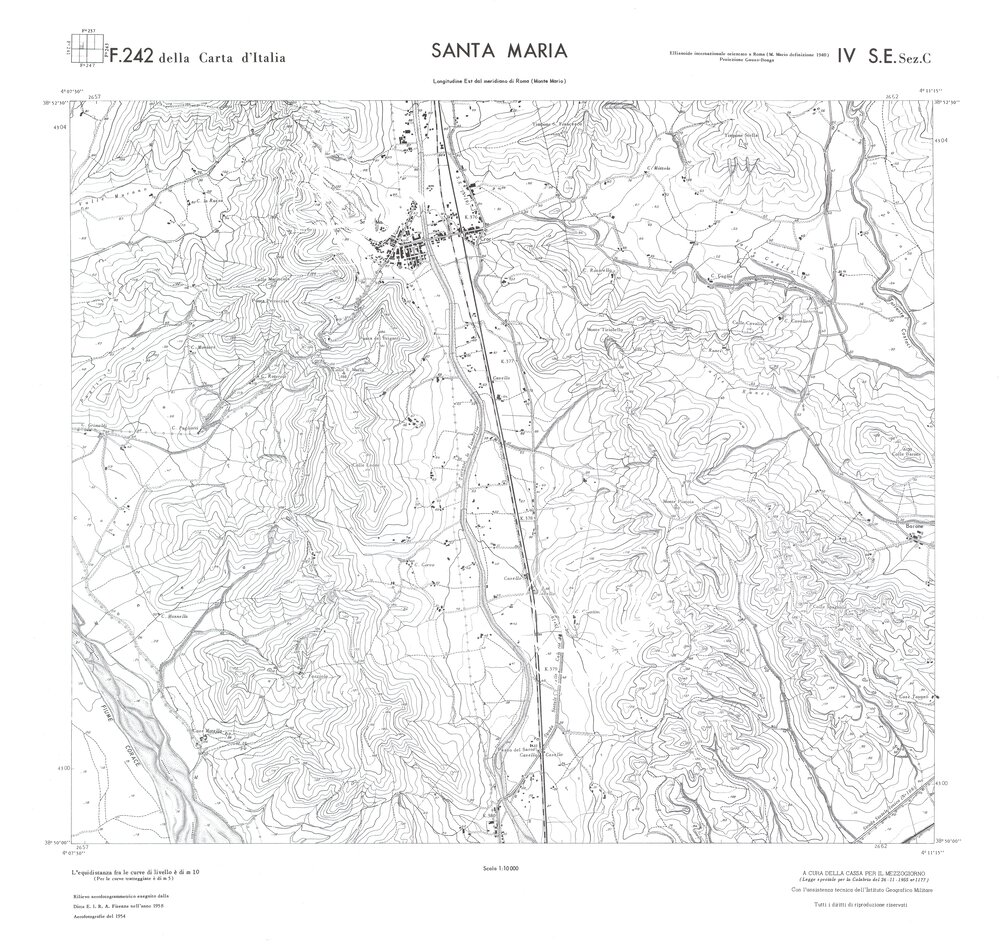 Rilievo eseguito da ditte private a cura della Cassa per il Mezzogiorno (legge speciale per la Calabria 26/11/1955 n°1177) con l’assistenza tecnica dell’ I.G.M. Rilievo aereofotogrammetrico,proiezione naturale,stampa in nero,equidistanza tra le curve mt.10. Le fotoriprese aeree furono eseguite nel 1954, l’elemento cartografico era la sezione di tavoletta, ossia 1/4 di tavoletta, distinta dalle lettere A;B;C;D.