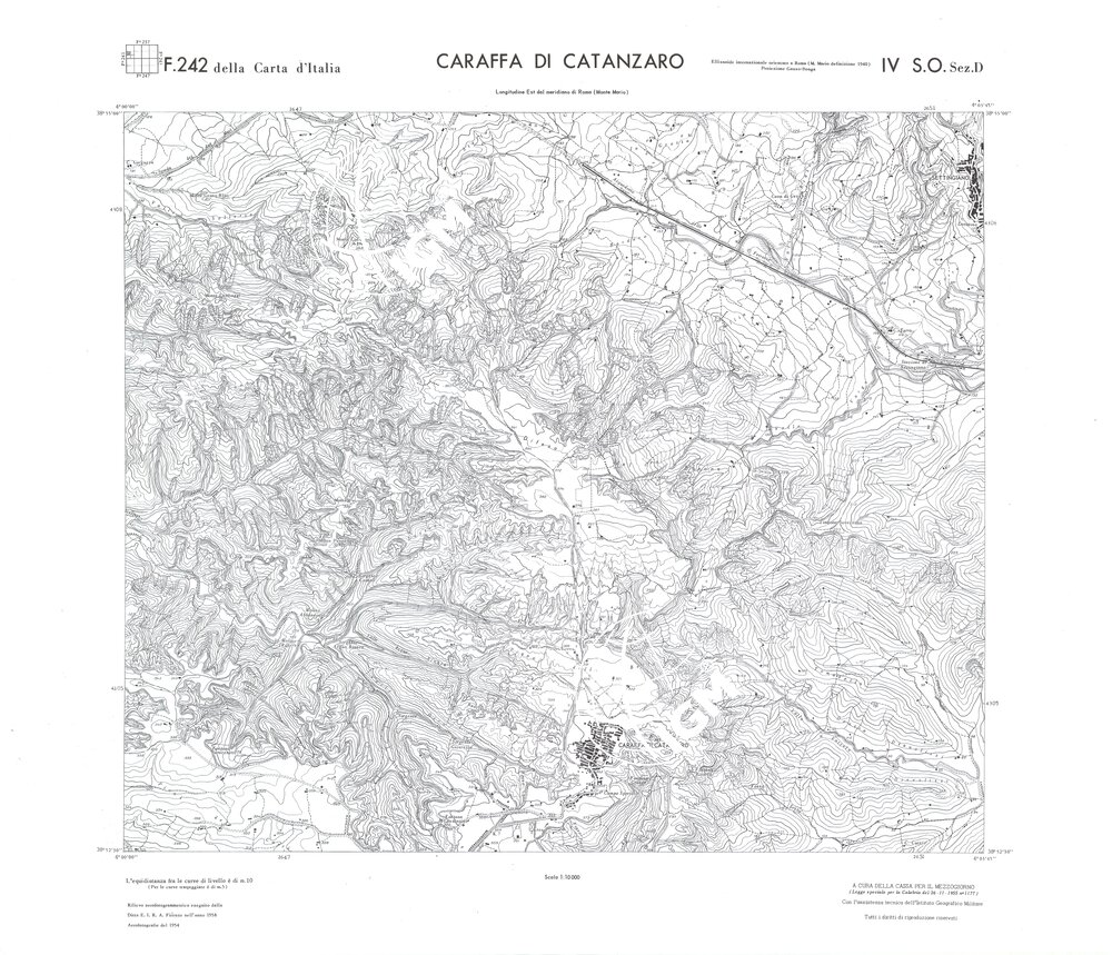 Rilievo eseguito da ditte private a cura della Cassa per il Mezzogiorno (legge speciale per la Calabria 26/11/1955 n°1177) con l’assistenza tecnica dell’ I.G.M. Rilievo aereofotogrammetrico,proiezione naturale,stampa in nero,equidistanza tra le curve mt.10. Le fotoriprese aeree furono eseguite nel 1954, l’elemento cartografico era la sezione di tavoletta, ossia 1/4 di tavoletta, distinta dalle lettere A;B;C;D.