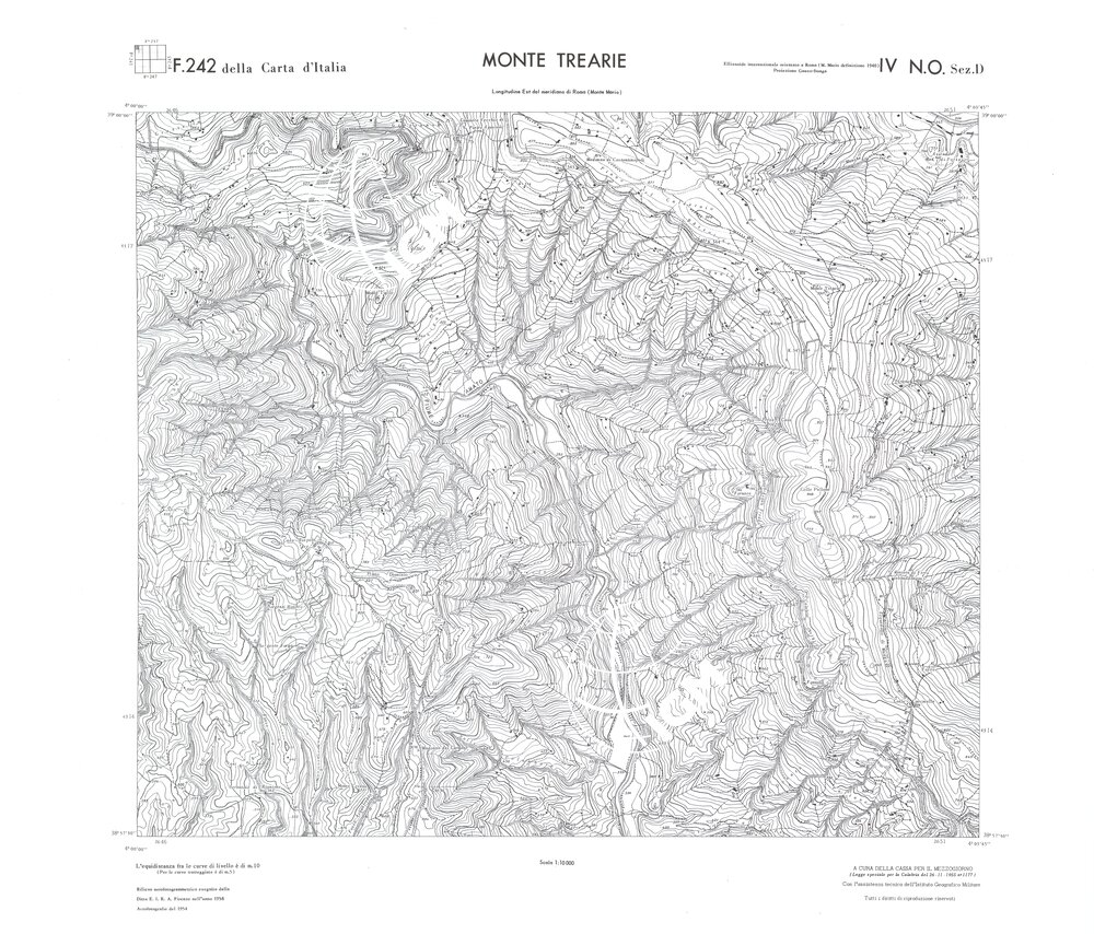Rilievo eseguito da ditte private a cura della Cassa per il Mezzogiorno (legge speciale per la Calabria 26/11/1955 n°1177) con l’assistenza tecnica dell’ I.G.M. Rilievo aereofotogrammetrico,proiezione naturale,stampa in nero,equidistanza tra le curve mt.10. Le fotoriprese aeree furono eseguite nel 1954, l’elemento cartografico era la sezione di tavoletta, ossia 1/4 di tavoletta, distinta dalle lettere A;B;C;D.