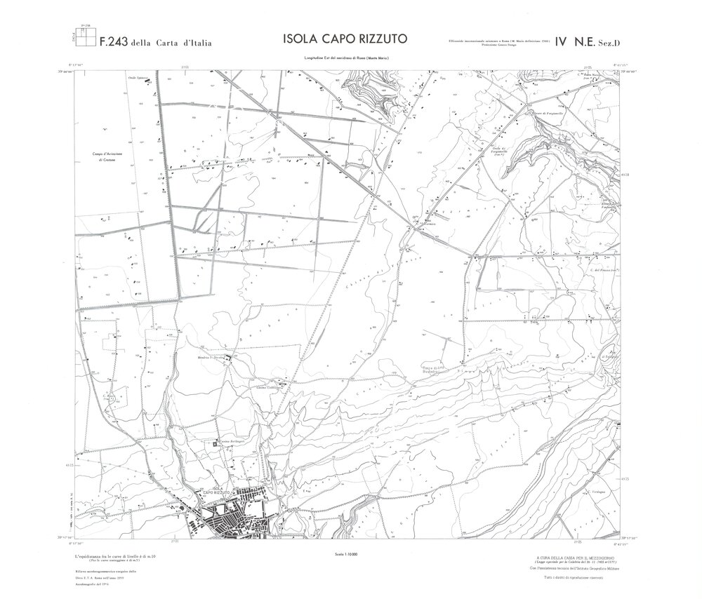 Rilievo eseguito da ditte private a cura della Cassa per il Mezzogiorno (legge speciale per la Calabria 26/11/1955 n°1177) con l’assistenza tecnica dell’ I.G.M. Rilievo aereofotogrammetrico,proiezione naturale,stampa in nero,equidistanza tra le curve mt.10. Le fotoriprese aeree furono eseguite nel 1954, l’elemento cartografico era la sezione di tavoletta, ossia 1/4 di tavoletta, distinta dalle lettere A;B;C;D.