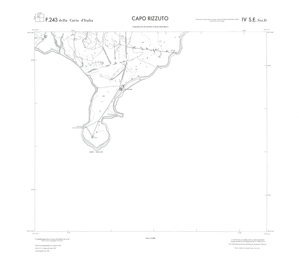 Rilievo eseguito da ditte private a cura della Cassa per il Mezzogiorno (legge speciale per la Calabria 26/11/1955 n°1177) con l’assistenza tecnica dell’ I.G.M. Rilievo aereofotogrammetrico,proiezione naturale,stampa in nero,equidistanza tra le curve mt.10. Le fotoriprese aeree furono eseguite nel 1954, l’elemento cartografico era la sezione di tavoletta, ossia 1/4 di tavoletta, distinta dalle lettere A;B;C;D.