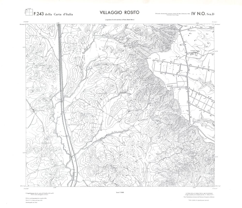 Rilievo eseguito da ditte private a cura della Cassa per il Mezzogiorno (legge speciale per la Calabria 26/11/1955 n°1177) con l’assistenza tecnica dell’ I.G.M. Rilievo aereofotogrammetrico,proiezione naturale,stampa in nero,equidistanza tra le curve mt.10. Le fotoriprese aeree furono eseguite nel 1954, l’elemento cartografico era la sezione di tavoletta, ossia 1/4 di tavoletta, distinta dalle lettere A;B;C;D.