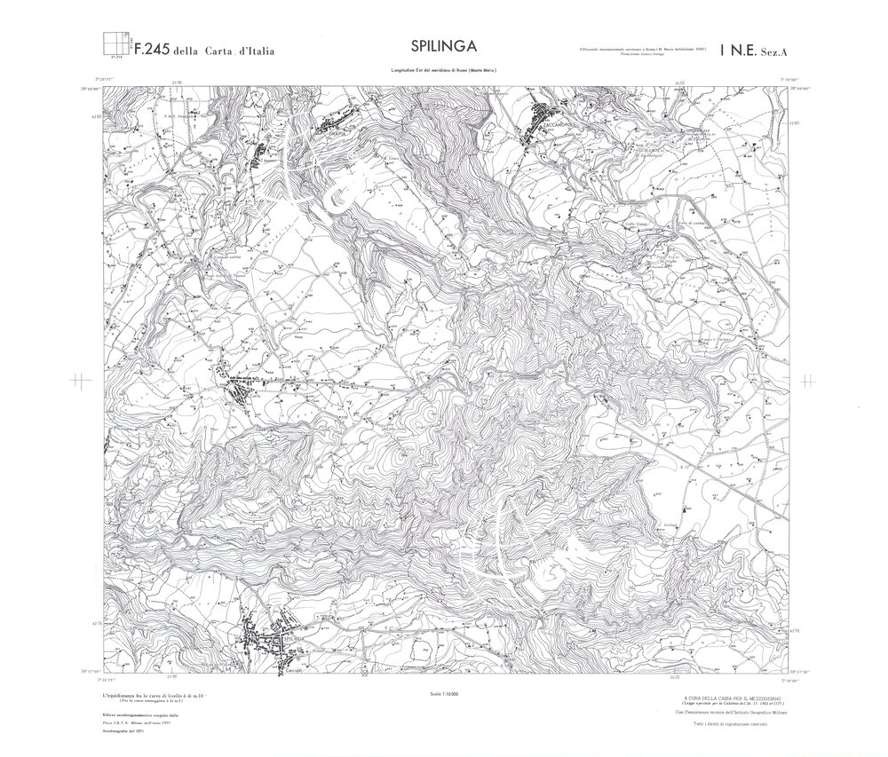 Rilievo eseguito da ditte private a cura della Cassa per il Mezzogiorno (legge speciale per la Calabria 26/11/1955 n°1177) con l’assistenza tecnica dell’ I.G.M. Rilievo aereofotogrammetrico,proiezione naturale,stampa in nero,equidistanza tra le curve mt.10. Le fotoriprese aeree furono eseguite nel 1954, l’elemento cartografico era la sezione di tavoletta, ossia 1/4 di tavoletta, distinta dalle lettere A;B;C;D.