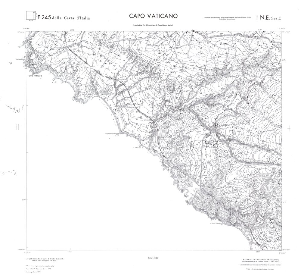 Rilievo eseguito da ditte private a cura della Cassa per il Mezzogiorno (legge speciale per la Calabria 26/11/1955 n°1177) con l’assistenza tecnica dell’ I.G.M. Rilievo aereofotogrammetrico,proiezione naturale,stampa in nero,equidistanza tra le curve mt.10. Le fotoriprese aeree furono eseguite nel 1954, l’elemento cartografico era la sezione di tavoletta, ossia 1/4 di tavoletta, distinta dalle lettere A;B;C;D.