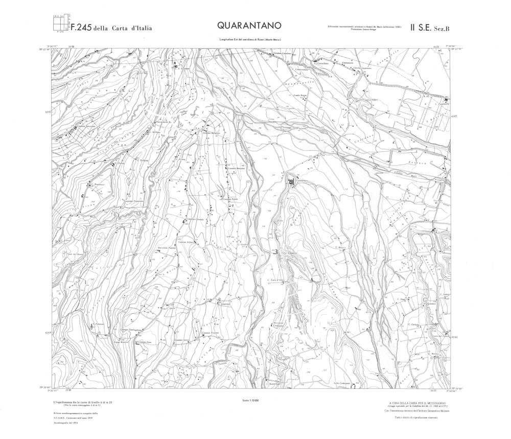 Rilievo eseguito da ditte private a cura della Cassa per il Mezzogiorno (legge speciale per la Calabria 26/11/1955 n°1177) con l’assistenza tecnica dell’ I.G.M. Rilievo aereofotogrammetrico,proiezione naturale,stampa in nero,equidistanza tra le curve mt.10. Le fotoriprese aeree furono eseguite nel 1954, l’elemento cartografico era la sezione di tavoletta, ossia 1/4 di tavoletta, distinta dalle lettere A;B;C;D.