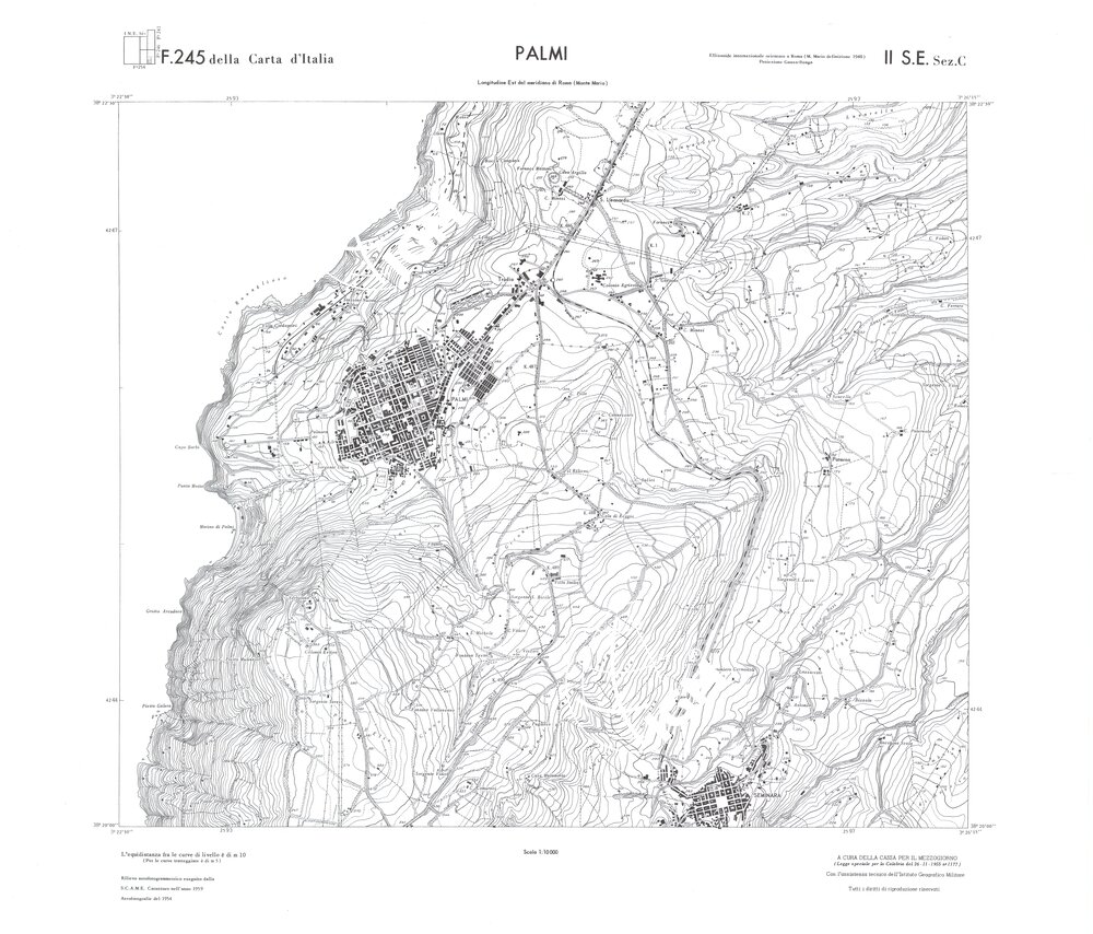Rilievo eseguito da ditte private a cura della Cassa per il Mezzogiorno (legge speciale per la Calabria 26/11/1955 n°1177) con l’assistenza tecnica dell’ I.G.M. Rilievo aereofotogrammetrico,proiezione naturale,stampa in nero,equidistanza tra le curve mt.10. Le fotoriprese aeree furono eseguite nel 1954, l’elemento cartografico era la sezione di tavoletta, ossia 1/4 di tavoletta, distinta dalle lettere A;B;C;D.