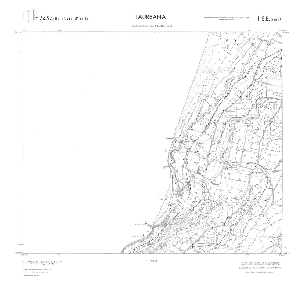 Rilievo eseguito da ditte private a cura della Cassa per il Mezzogiorno (legge speciale per la Calabria 26/11/1955 n°1177) con l’assistenza tecnica dell’ I.G.M. Rilievo aereofotogrammetrico,proiezione naturale,stampa in nero,equidistanza tra le curve mt.10. Le fotoriprese aeree furono eseguite nel 1954, l’elemento cartografico era la sezione di tavoletta, ossia 1/4 di tavoletta, distinta dalle lettere A;B;C;D.