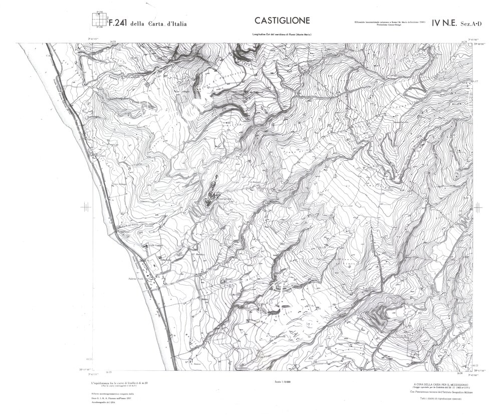 Rilievo eseguito da ditte private a cura della Cassa per il Mezzogiorno (legge speciale per la Calabria 26/11/1955 n°1177) con l’assistenza tecnica dell’ I.G.M. Rilievo aereofotogrammetrico,proiezione naturale,stampa in nero,equidistanza tra le curve mt.10. Le fotoriprese aeree furono eseguite nel 1954, l’elemento cartografico era la sezione di tavoletta, ossia 1/4 di tavoletta, distinta dalle lettere A;B;C;D.