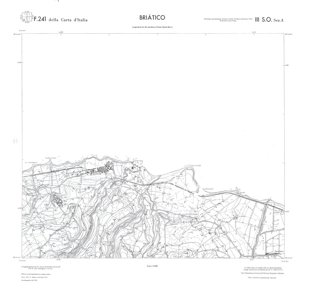 Rilievo eseguito da ditte private a cura della Cassa per il Mezzogiorno (legge speciale per la Calabria 26/11/1955 n°1177) con l’assistenza tecnica dell’ I.G.M. Rilievo aereofotogrammetrico,proiezione naturale,stampa in nero,equidistanza tra le curve mt.10. Le fotoriprese aeree furono eseguite nel 1954, l’elemento cartografico era la sezione di tavoletta, ossia 1/4 di tavoletta, distinta dalle lettere A;B;C;D.
