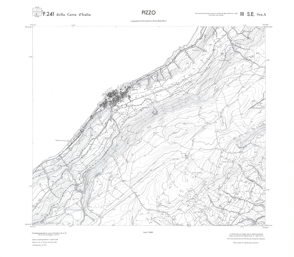 Rilievo eseguito da ditte private a cura della Cassa per il Mezzogiorno (legge speciale per la Calabria 26/11/1955 n°1177) con l’assistenza tecnica dell’ I.G.M. Rilievo aereofotogrammetrico,proiezione naturale,stampa in nero,equidistanza tra le curve mt.10. Le fotoriprese aeree furono eseguite nel 1954, l’elemento cartografico era la sezione di tavoletta, ossia 1/4 di tavoletta, distinta dalle lettere A;B;C;D.