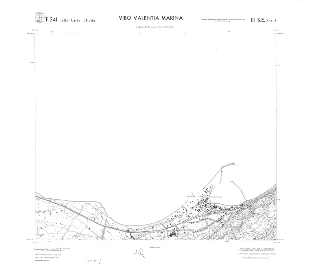 Rilievo eseguito da ditte private a cura della Cassa per il Mezzogiorno (legge speciale per la Calabria 26/11/1955 n°1177) con l’assistenza tecnica dell’ I.G.M. Rilievo aereofotogrammetrico,proiezione naturale,stampa in nero,equidistanza tra le curve mt.10. Le fotoriprese aeree furono eseguite nel 1954, l’elemento cartografico era la sezione di tavoletta, ossia 1/4 di tavoletta, distinta dalle lettere A;B;C;D.