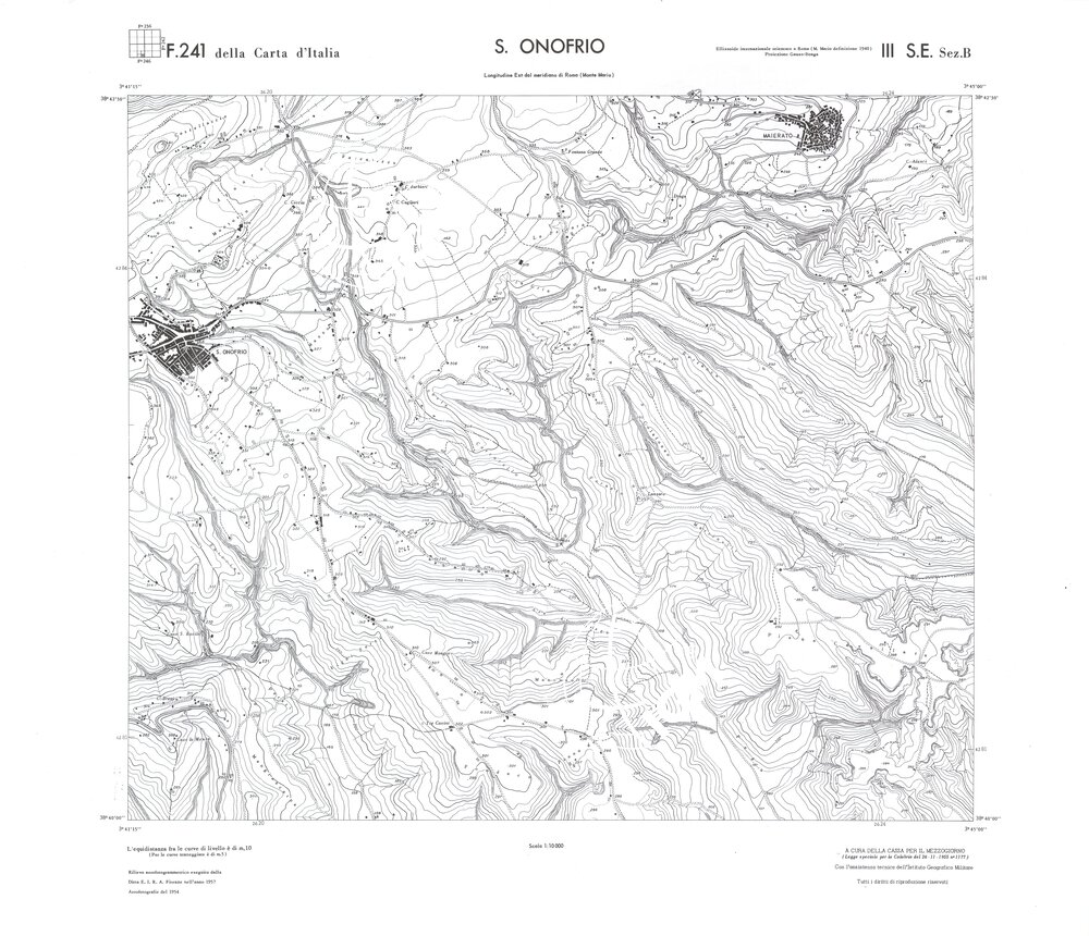 Rilievo eseguito da ditte private a cura della Cassa per il Mezzogiorno (legge speciale per la Calabria 26/11/1955 n°1177) con l’assistenza tecnica dell’ I.G.M. Rilievo aereofotogrammetrico,proiezione naturale,stampa in nero,equidistanza tra le curve mt.10. Le fotoriprese aeree furono eseguite nel 1954, l’elemento cartografico era la sezione di tavoletta, ossia 1/4 di tavoletta, distinta dalle lettere A;B;C;D.