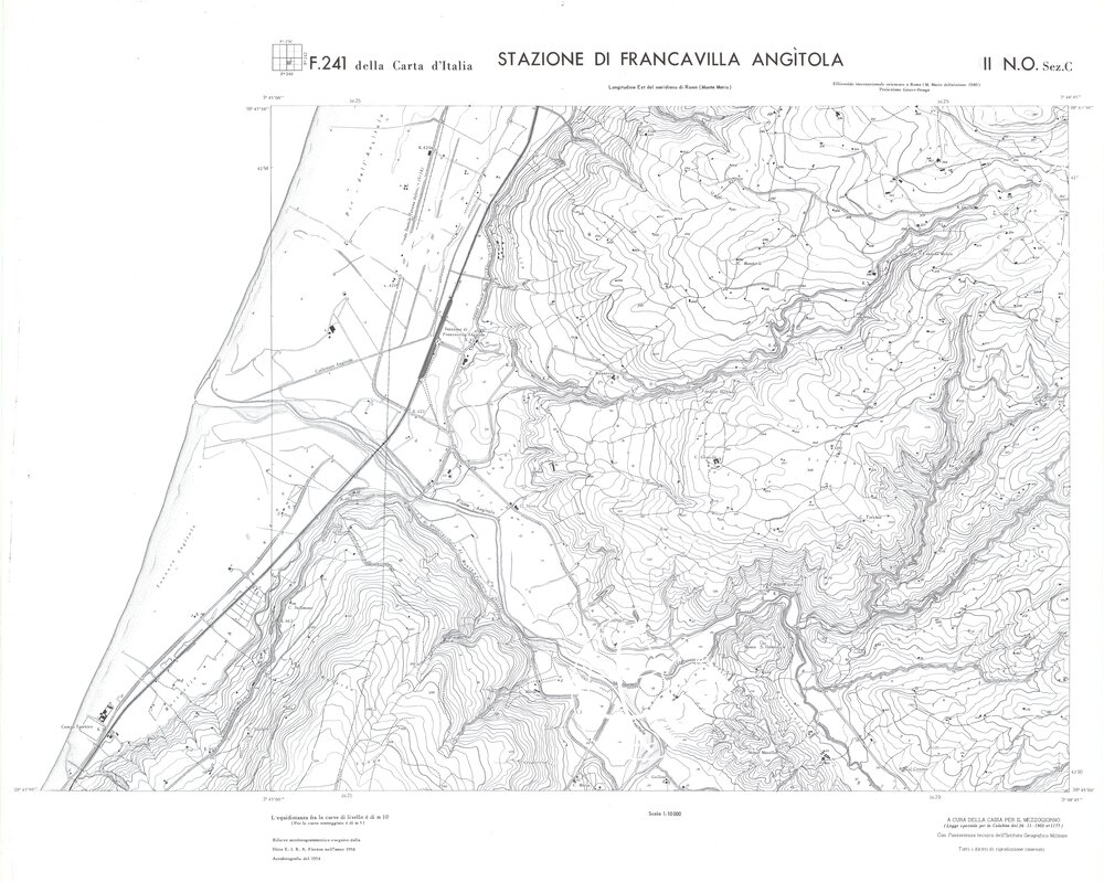 Rilievo eseguito da ditte private a cura della Cassa per il Mezzogiorno (legge speciale per la Calabria 26/11/1955 n°1177) con l’assistenza tecnica dell’ I.G.M. Rilievo aereofotogrammetrico,proiezione naturale,stampa in nero,equidistanza tra le curve mt.10. Le fotoriprese aeree furono eseguite nel 1954, l’elemento cartografico era la sezione di tavoletta, ossia 1/4 di tavoletta, distinta dalle lettere A;B;C;D.