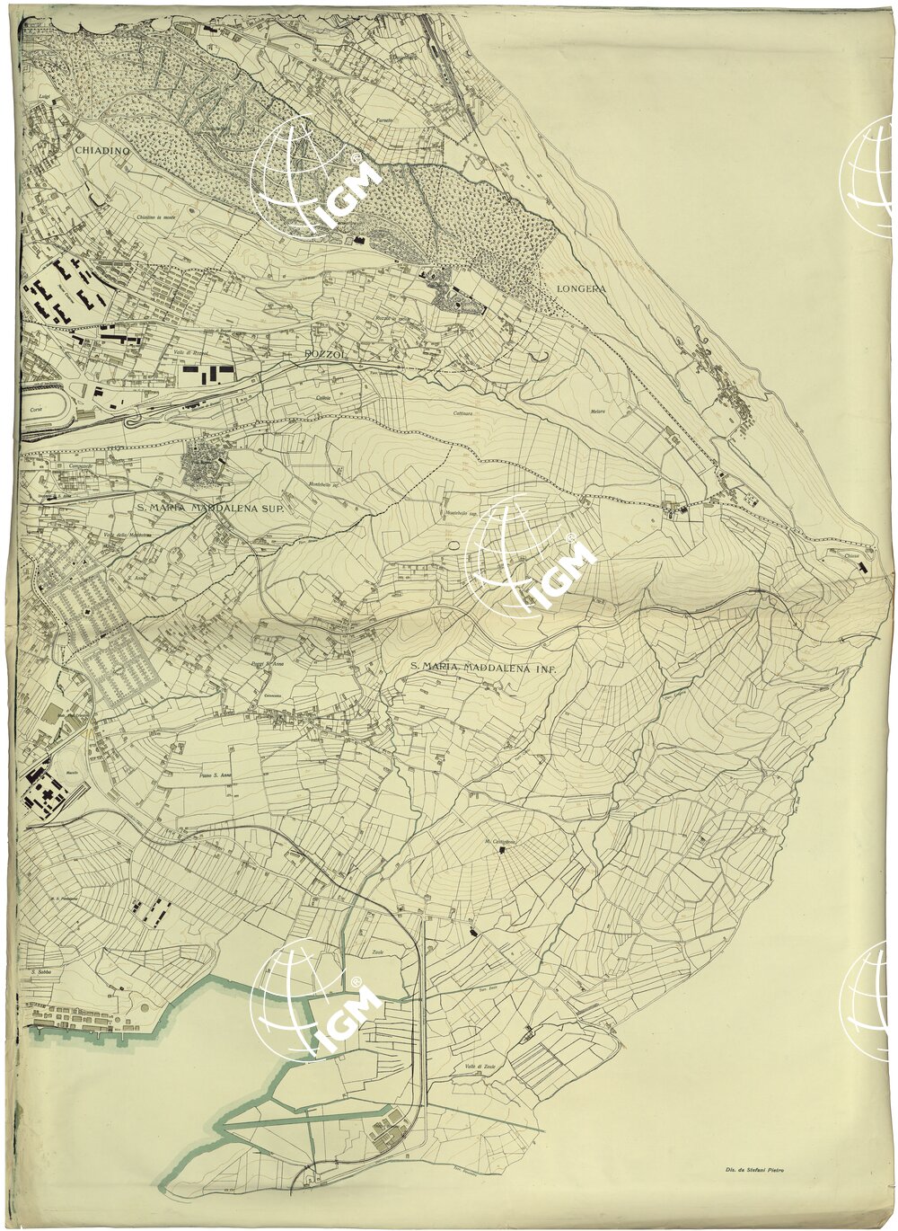 Pubblicata dall’Ufficio Tecnico Comunale. Nero: planimetria; bistro: fondo case; verde: fondo acque. Dis. da Stefani Pietro. Stab. Tipo-Litografico G. Chiesa, Udine.
