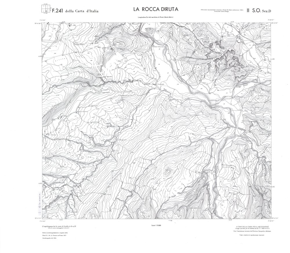Rilievo eseguito da ditte private a cura della Cassa per il Mezzogiorno (legge speciale per la Calabria 26/11/1955 n°1177) con l’assistenza tecnica dell’ I.G.M. Rilievo aereofotogrammetrico,proiezione naturale,stampa in nero,equidistanza tra le curve mt.10. Le fotoriprese aeree furono eseguite nel 1954, l’elemento cartografico era la sezione di tavoletta, ossia 1/4 di tavoletta, distinta dalle lettere A;B;C;D.