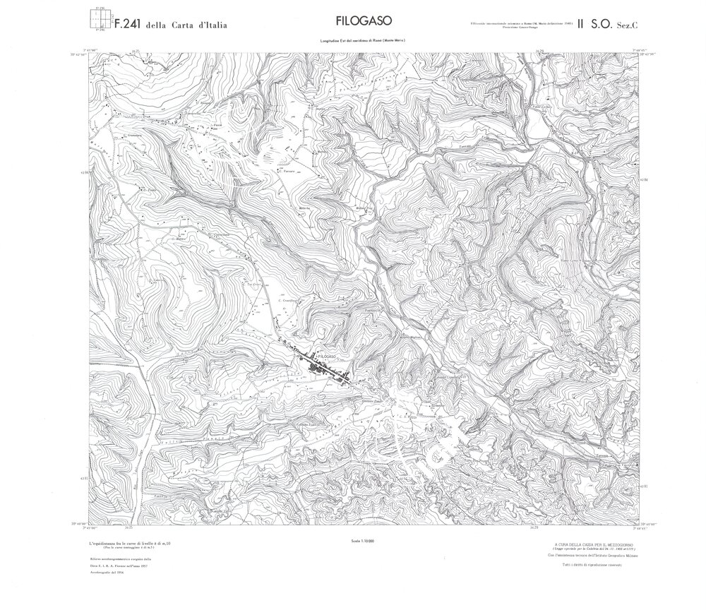 Rilievo eseguito da ditte private a cura della Cassa per il Mezzogiorno (legge speciale per la Calabria 26/11/1955 n°1177) con l’assistenza tecnica dell’ I.G.M. Rilievo aereofotogrammetrico,proiezione naturale,stampa in nero,equidistanza tra le curve mt.10. Le fotoriprese aeree furono eseguite nel 1954, l’elemento cartografico era la sezione di tavoletta, ossia 1/4 di tavoletta, distinta dalle lettere A;B;C;D.
