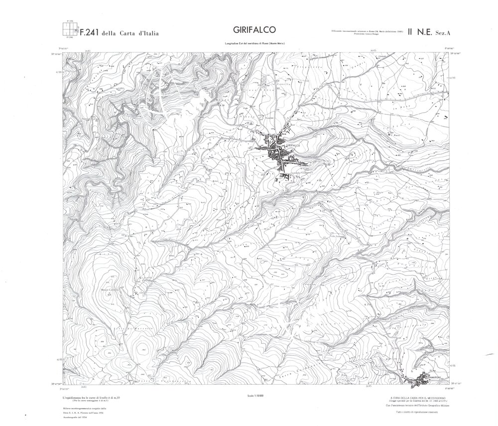 Rilievo eseguito da ditte private a cura della Cassa per il Mezzogiorno (legge speciale per la Calabria 26/11/1955 n°1177) con l’assistenza tecnica dell’ I.G.M. Rilievo aereofotogrammetrico,proiezione naturale,stampa in nero,equidistanza tra le curve mt.10. Le fotoriprese aeree furono eseguite nel 1954, l’elemento cartografico era la sezione di tavoletta, ossia 1/4 di tavoletta, distinta dalle lettere A;B;C;D.
