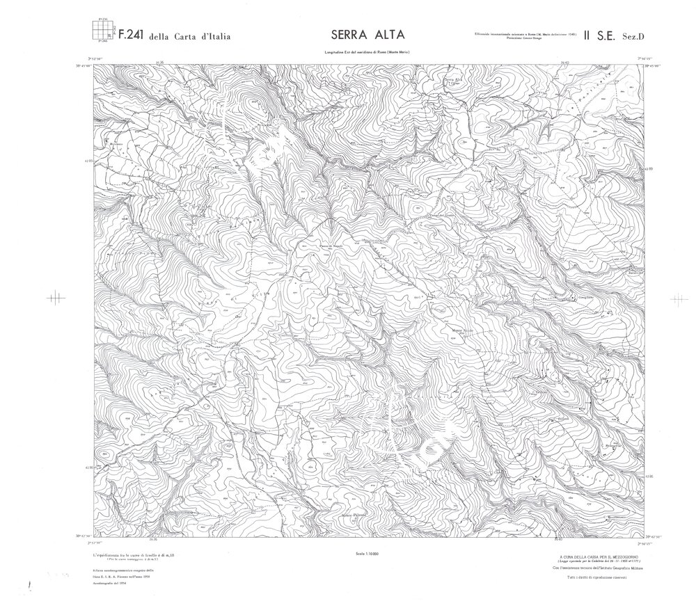 Rilievo eseguito da ditte private a cura della Cassa per il Mezzogiorno (legge speciale per la Calabria 26/11/1955 n°1177) con l’assistenza tecnica dell’ I.G.M. Rilievo aereofotogrammetrico,proiezione naturale,stampa in nero,equidistanza tra le curve mt.10. Le fotoriprese aeree furono eseguite nel 1954, l’elemento cartografico era la sezione di tavoletta, ossia 1/4 di tavoletta, distinta dalle lettere A;B;C;D.