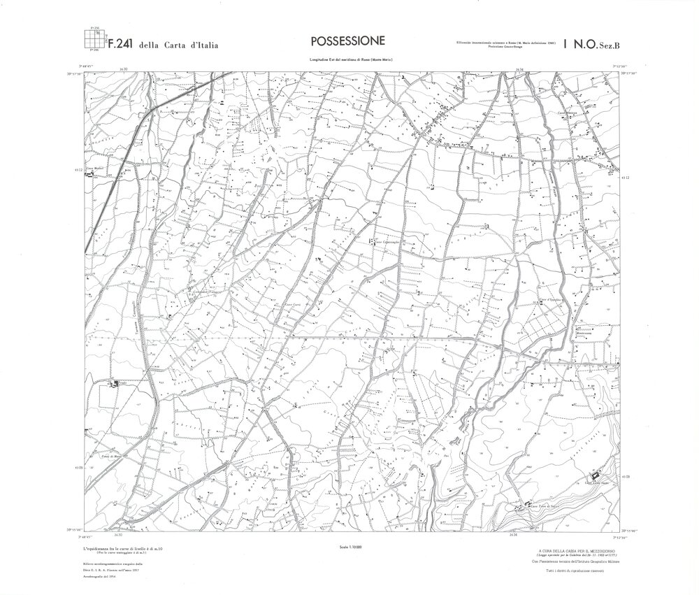 Rilievo eseguito da ditte private a cura della Cassa per il Mezzogiorno (legge speciale per la Calabria 26/11/1955 n°1177) con l’assistenza tecnica dell’ I.G.M. Rilievo aereofotogrammetrico,proiezione naturale,stampa in nero,equidistanza tra le curve mt.10. Le fotoriprese aeree furono eseguite nel 1954, l’elemento cartografico era la sezione di tavoletta, ossia 1/4 di tavoletta, distinta dalle lettere A;B;C;D.