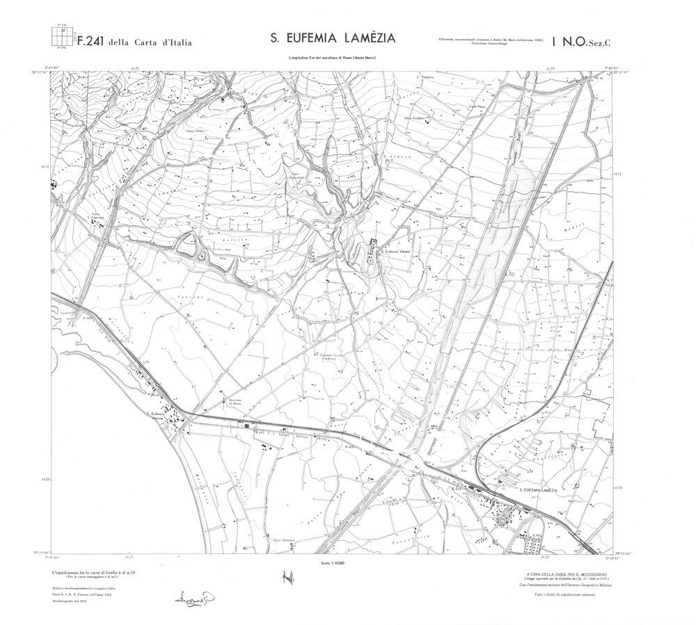 Rilievo eseguito da ditte private a cura della Cassa per il Mezzogiorno (legge speciale per la Calabria 26/11/1955 n°1177) con l’assistenza tecnica dell’ I.G.M. Rilievo aereofotogrammetrico,proiezione naturale,stampa in nero,equidistanza tra le curve mt.10. Le fotoriprese aeree furono eseguite nel 1954, l’elemento cartografico era la sezione di tavoletta, ossia 1/4 di tavoletta, distinta dalle lettere A;B;C;D.