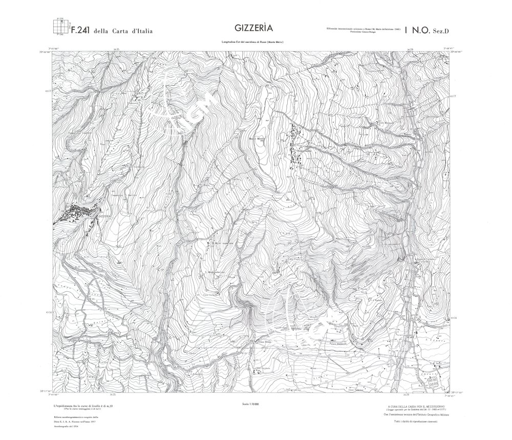 Rilievo eseguito da ditte private a cura della Cassa per il Mezzogiorno (legge speciale per la Calabria 26/11/1955 n°1177) con l’assistenza tecnica dell’ I.G.M. Rilievo aereofotogrammetrico,proiezione naturale,stampa in nero,equidistanza tra le curve mt.10. Le fotoriprese aeree furono eseguite nel 1954, l’elemento cartografico era la sezione di tavoletta, ossia 1/4 di tavoletta, distinta dalle lettere A;B;C;D.