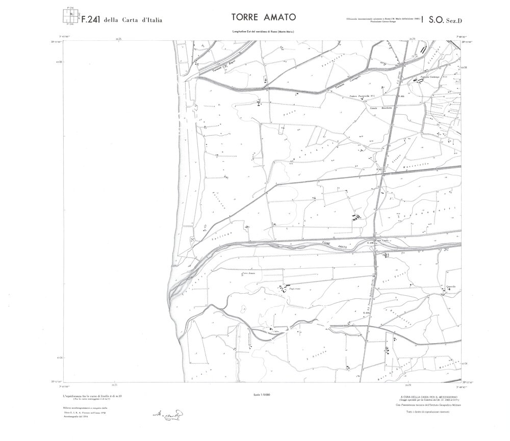 Rilievo eseguito da ditte private a cura della Cassa per il Mezzogiorno (legge speciale per la Calabria 26/11/1955 n°1177) con l’assistenza tecnica dell’ I.G.M. Rilievo aereofotogrammetrico,proiezione naturale,stampa in nero,equidistanza tra le curve mt.10. Le fotoriprese aeree furono eseguite nel 1954, l’elemento cartografico era la sezione di tavoletta, ossia 1/4 di tavoletta, distinta dalle lettere A;B;C;D.