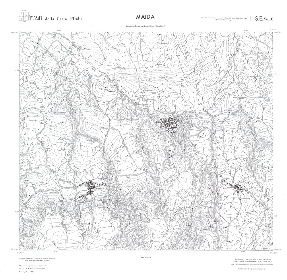 Rilievo eseguito da ditte private a cura della Cassa per il Mezzogiorno (legge speciale per la Calabria 26/11/1955 n°1177) con l’assistenza tecnica dell’ I.G.M. Rilievo aereofotogrammetrico,proiezione naturale,stampa in nero,equidistanza tra le curve mt.10. Le fotoriprese aeree furono eseguite nel 1954, l’elemento cartografico era la sezione di tavoletta, ossia 1/4 di tavoletta, distinta dalle lettere A;B;C;D.