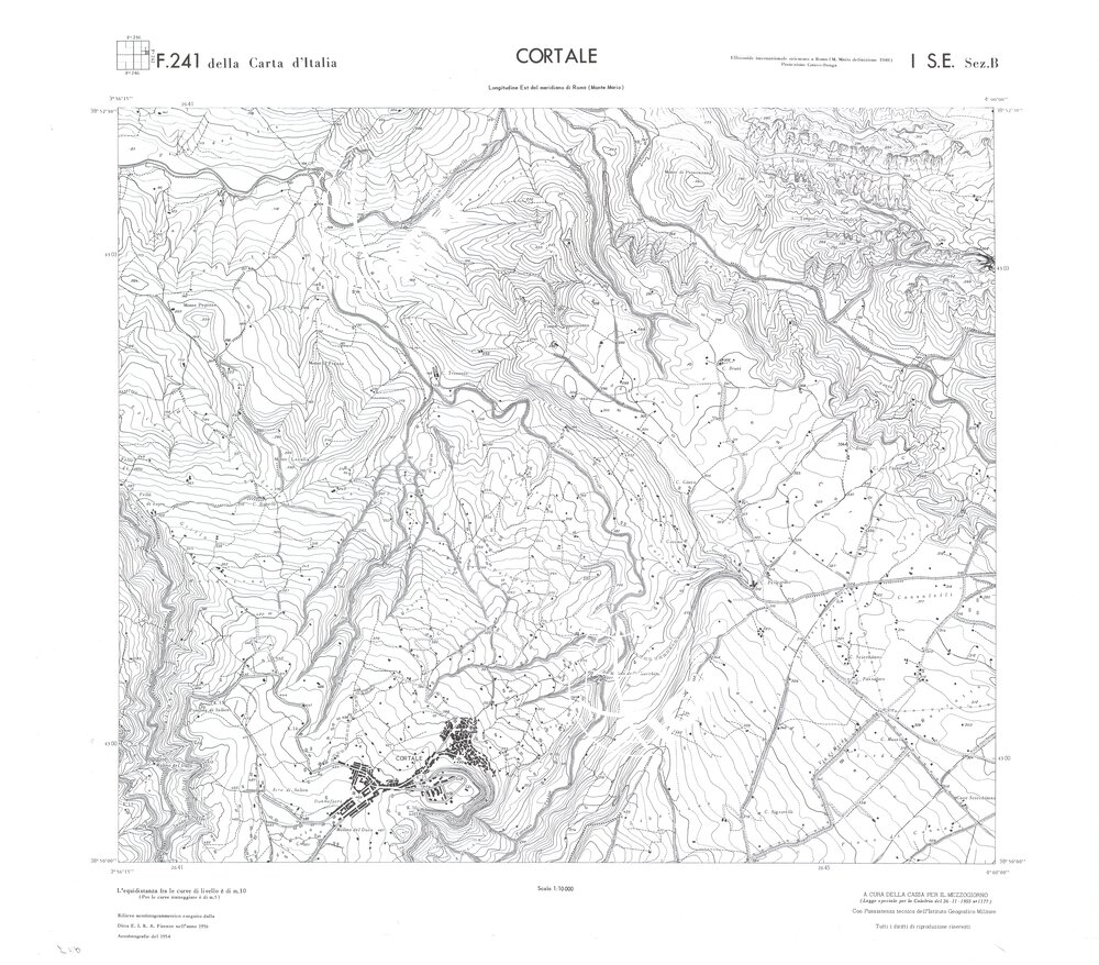 Rilievo eseguito da ditte private a cura della Cassa per il Mezzogiorno (legge speciale per la Calabria 26/11/1955 n°1177) con l’assistenza tecnica dell’ I.G.M. Rilievo aereofotogrammetrico,proiezione naturale,stampa in nero,equidistanza tra le curve mt.10. Le fotoriprese aeree furono eseguite nel 1954, l’elemento cartografico era la sezione di tavoletta, ossia 1/4 di tavoletta, distinta dalle lettere A;B;C;D.