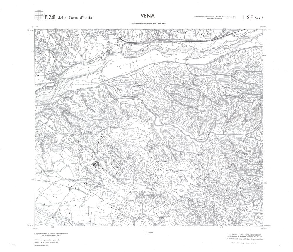 Rilievo eseguito da ditte private a cura della Cassa per il Mezzogiorno (legge speciale per la Calabria 26/11/1955 n°1177) con l’assistenza tecnica dell’ I.G.M. Rilievo aereofotogrammetrico,proiezione naturale,stampa in nero,equidistanza tra le curve mt.10. Le fotoriprese aeree furono eseguite nel 1954, l’elemento cartografico era la sezione di tavoletta, ossia 1/4 di tavoletta, distinta dalle lettere A;B;C;D.