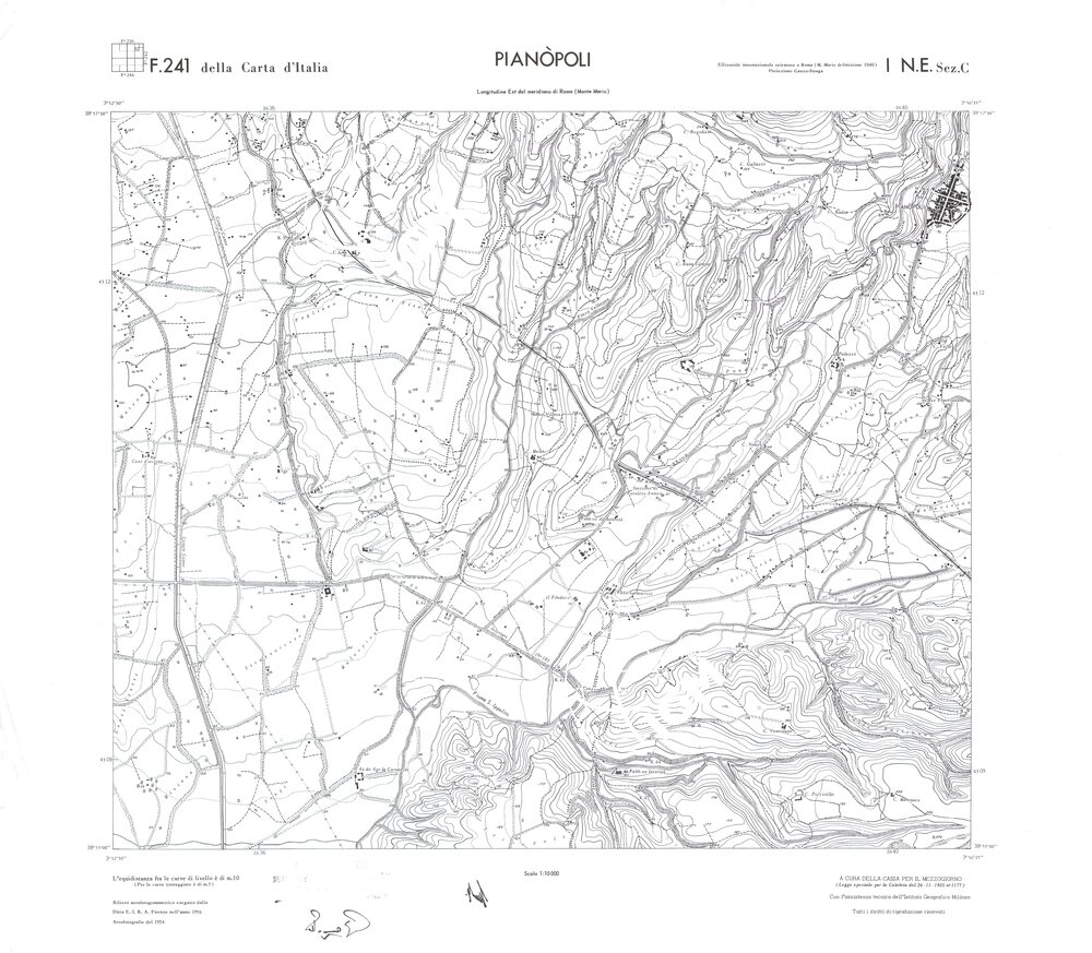 Rilievo eseguito da ditte private a cura della Cassa per il Mezzogiorno (legge speciale per la Calabria 26/11/1955 n°1177) con l’assistenza tecnica dell’ I.G.M. Rilievo aereofotogrammetrico,proiezione naturale,stampa in nero,equidistanza tra le curve mt.10. Le fotoriprese aeree furono eseguite nel 1954, l’elemento cartografico era la sezione di tavoletta, ossia 1/4 di tavoletta, distinta dalle lettere A;B;C;D.