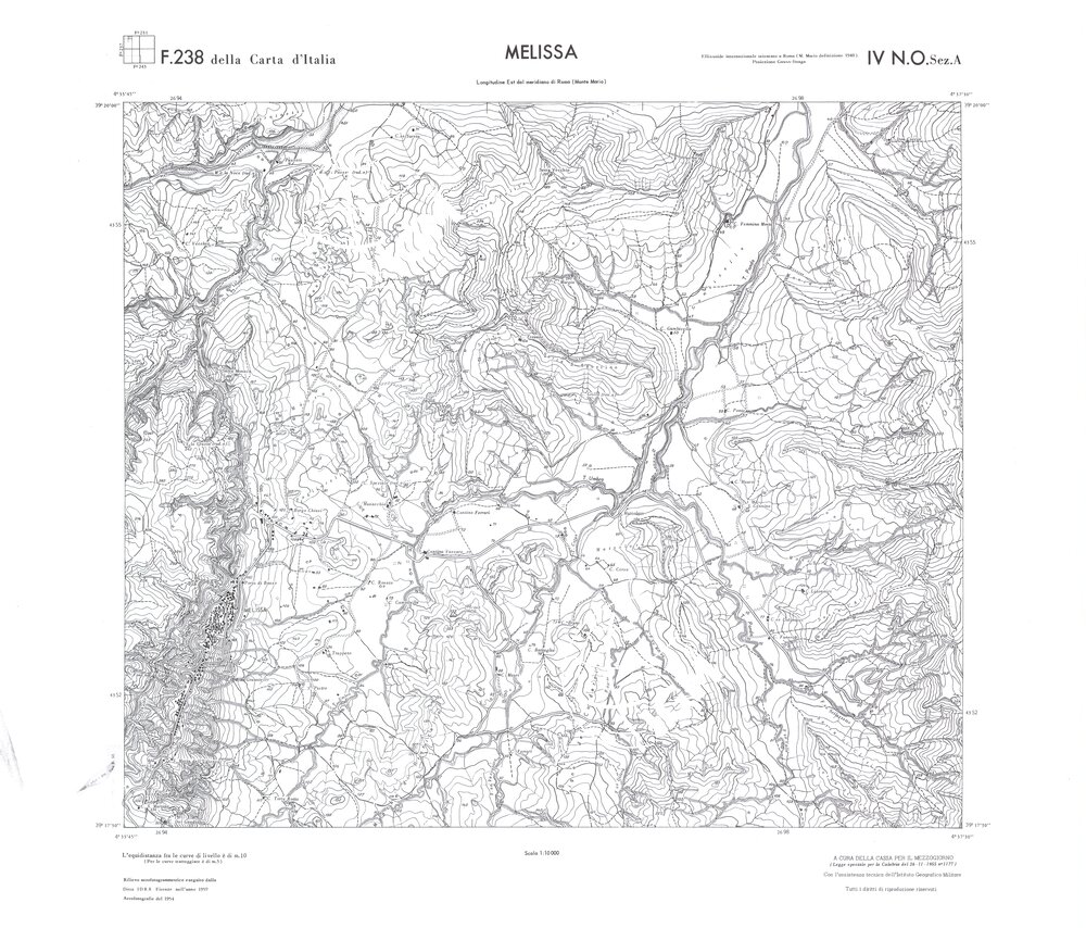 Rilievo eseguito da ditte private a cura della Cassa per il Mezzogiorno (legge speciale per la Calabria 26/11/1955 n°1177) con l’assistenza tecnica dell’ I.G.M. Rilievo aereofotogrammetrico,proiezione naturale,stampa in nero,equidistanza tra le curve mt.10. Le fotoriprese aeree furono eseguite nel 1954, l’elemento cartografico era la sezione di tavoletta, ossia 1/4 di tavoletta, distinta dalle lettere A;B;C;D.