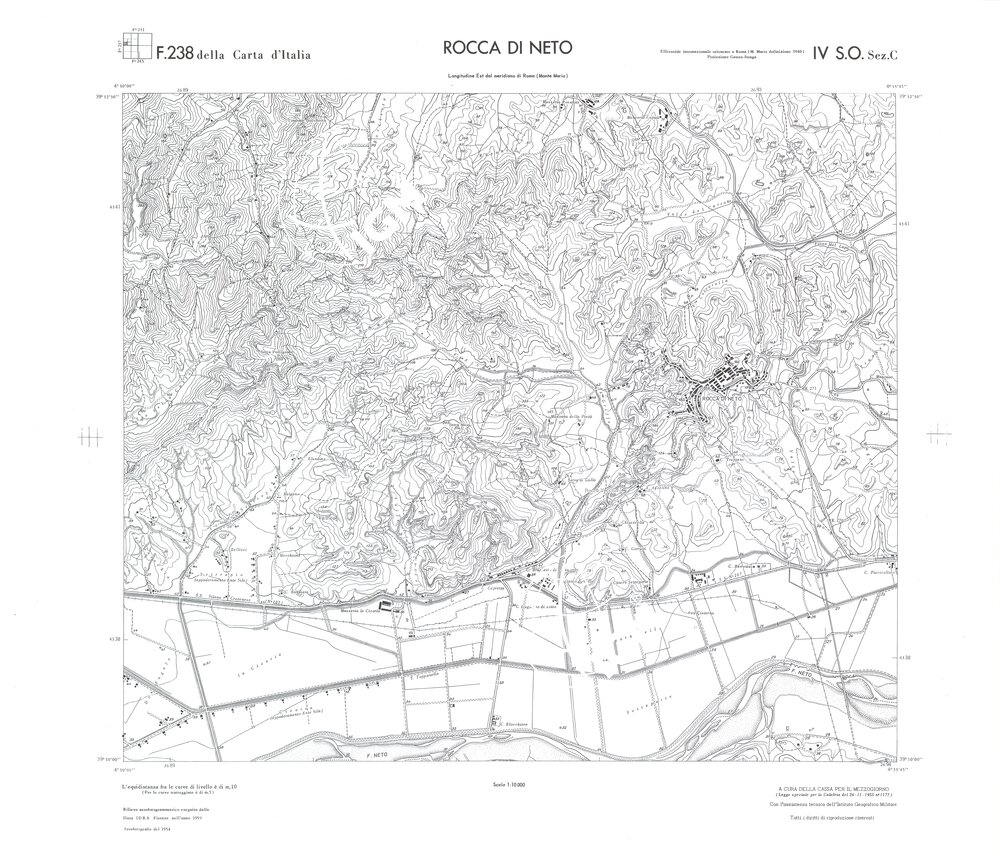 Rilievo eseguito da ditte private a cura della Cassa per il Mezzogiorno (legge speciale per la Calabria 26/11/1955 n°1177) con l’assistenza tecnica dell’ I.G.M. Rilievo aereofotogrammetrico,proiezione naturale,stampa in nero,equidistanza tra le curve mt.10. Le fotoriprese aeree furono eseguite nel 1954, l’elemento cartografico era la sezione di tavoletta, ossia 1/4 di tavoletta, distinta dalle lettere A;B;C;D.