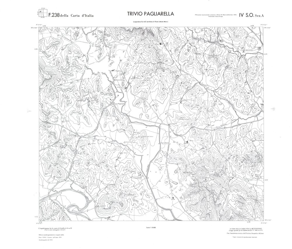 Rilievo eseguito da ditte private a cura della Cassa per il Mezzogiorno (legge speciale per la Calabria 26/11/1955 n°1177) con l’assistenza tecnica dell’ I.G.M. Rilievo aereofotogrammetrico,proiezione naturale,stampa in nero,equidistanza tra le curve mt.10. Le fotoriprese aeree furono eseguite nel 1954, l’elemento cartografico era la sezione di tavoletta, ossia 1/4 di tavoletta, distinta dalle lettere A;B;C;D.