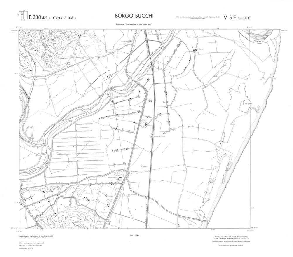 Rilievo eseguito da ditte private a cura della Cassa per il Mezzogiorno (legge speciale per la Calabria 26/11/1955 n°1177) con l’assistenza tecnica dell’ I.G.M. Rilievo aereofotogrammetrico,proiezione naturale,stampa in nero,equidistanza tra le curve mt.10. Le fotoriprese aeree furono eseguite nel 1954, l’elemento cartografico era la sezione di tavoletta, ossia 1/4 di tavoletta, distinta dalle lettere A;B;C;D.