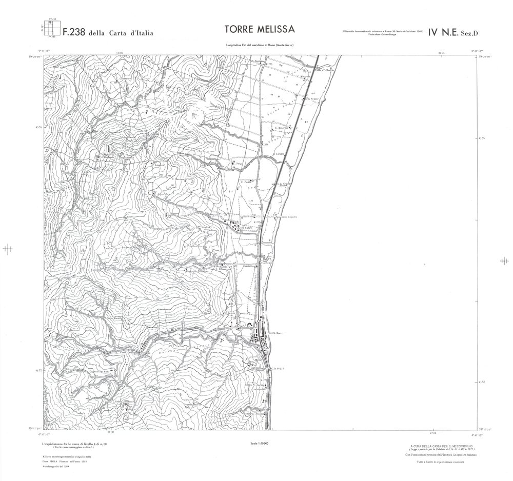 Rilievo eseguito da ditte private a cura della Cassa per il Mezzogiorno (legge speciale per la Calabria 26/11/1955 n°1177) con l’assistenza tecnica dell’ I.G.M. Rilievo aereofotogrammetrico,proiezione naturale,stampa in nero,equidistanza tra le curve mt.10. Le fotoriprese aeree furono eseguite nel 1954, l’elemento cartografico era la sezione di tavoletta, ossia 1/4 di tavoletta, distinta dalle lettere A;B;C;D.