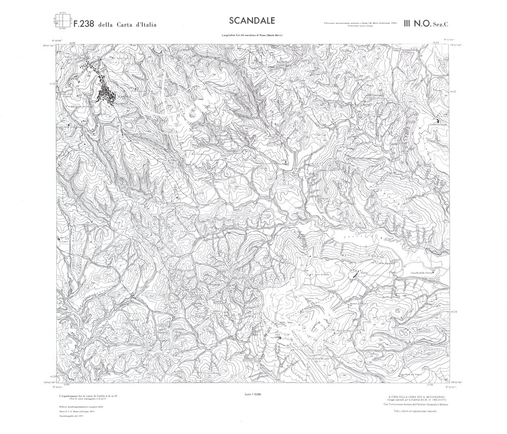 Rilievo eseguito da ditte private a cura della Cassa per il Mezzogiorno (legge speciale per la Calabria 26/11/1955 n°1177) con l’assistenza tecnica dell’ I.G.M. Rilievo aereofotogrammetrico,proiezione naturale,stampa in nero,equidistanza tra le curve mt.10. Le fotoriprese aeree furono eseguite nel 1954, l’elemento cartografico era la sezione di tavoletta, ossia 1/4 di tavoletta, distinta dalle lettere A;B;C;D.