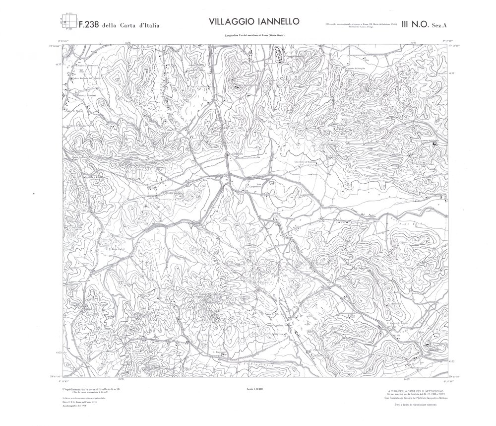 Rilievo eseguito da ditte private a cura della Cassa per il Mezzogiorno (legge speciale per la Calabria 26/11/1955 n°1177) con l’assistenza tecnica dell’ I.G.M. Rilievo aereofotogrammetrico,proiezione naturale,stampa in nero,equidistanza tra le curve mt.10. Le fotoriprese aeree furono eseguite nel 1954, l’elemento cartografico era la sezione di tavoletta, ossia 1/4 di tavoletta, distinta dalle lettere A;B;C;D.