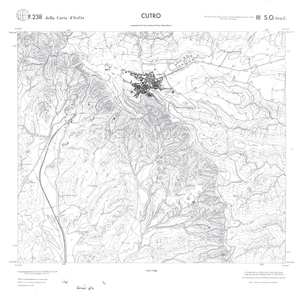 Rilievo eseguito da ditte private a cura della Cassa per il Mezzogiorno (legge speciale per la Calabria 26/11/1955 n°1177) con l’assistenza tecnica dell’ I.G.M. Rilievo aereofotogrammetrico,proiezione naturale,stampa in nero,equidistanza tra le curve mt.10. Le fotoriprese aeree furono eseguite nel 1954, l’elemento cartografico era la sezione di tavoletta, ossia 1/4 di tavoletta, distinta dalle lettere A;B;C;D.