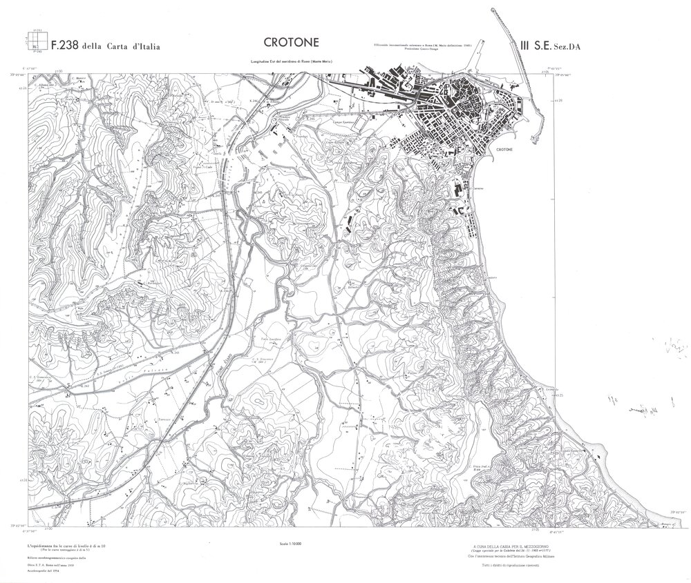 Rilievo eseguito da ditte private a cura della Cassa per il Mezzogiorno (legge speciale per la Calabria 26/11/1955 n°1177) con l’assistenza tecnica dell’ I.G.M. Rilievo aereofotogrammetrico,proiezione naturale,stampa in nero,equidistanza tra le curve mt.10. Le fotoriprese aeree furono eseguite nel 1954, l’elemento cartografico era la sezione di tavoletta, ossia 1/4 di tavoletta, distinta dalle lettere A;B;C;D.