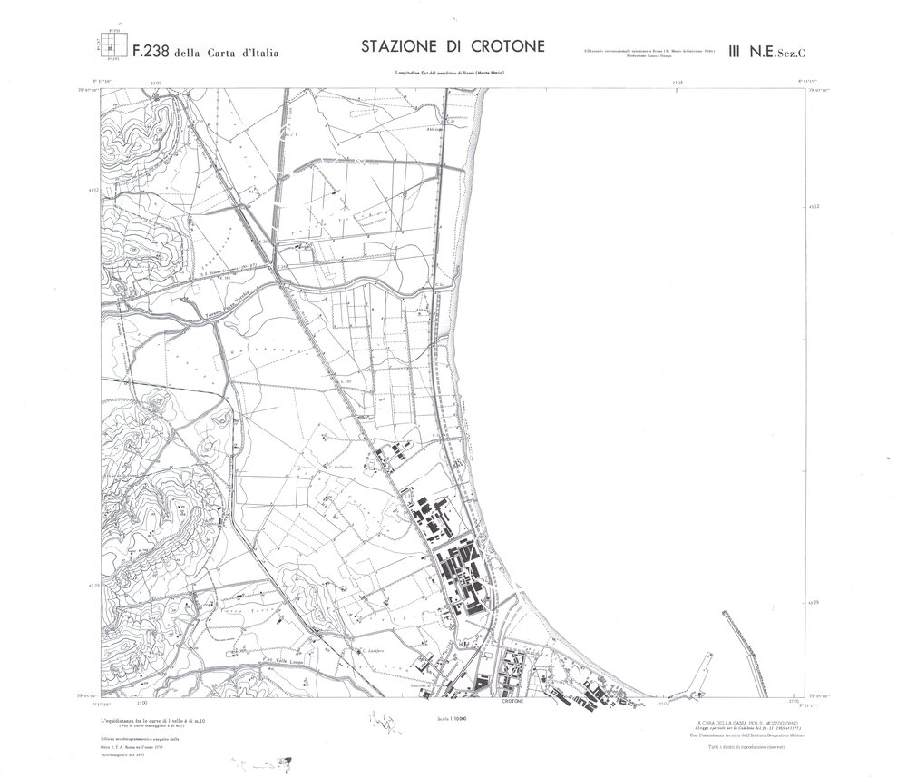 Rilievo eseguito da ditte private a cura della Cassa per il Mezzogiorno (legge speciale per la Calabria 26/11/1955 n°1177) con l’assistenza tecnica dell’ I.G.M. Rilievo aereofotogrammetrico,proiezione naturale,stampa in nero,equidistanza tra le curve mt.10. Le fotoriprese aeree furono eseguite nel 1954, l’elemento cartografico era la sezione di tavoletta, ossia 1/4 di tavoletta, distinta dalle lettere A;B;C;D.