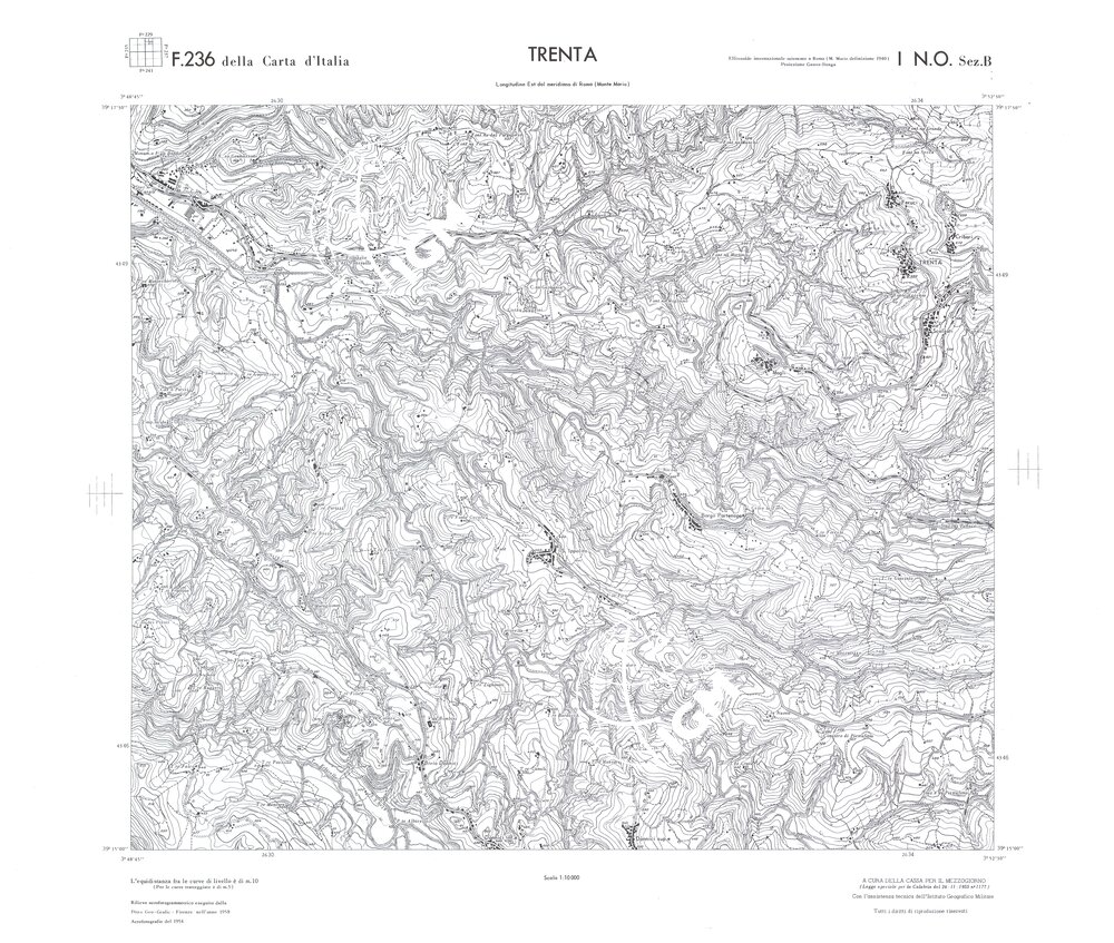Rilievo eseguito da ditte private a cura della Cassa per il Mezzogiorno (legge speciale per la Calabria 26/11/1955 n°1177) con l’assistenza tecnica dell’ I.G.M. Rilievo aereofotogrammetrico,proiezione naturale,stampa in nero,equidistanza tra le curve mt.10. Le fotoriprese aeree furono eseguite nel 1954, l’elemento cartografico era la sezione di tavoletta, ossia 1/4 di tavoletta, distinta dalle lettere A;B;C;D.