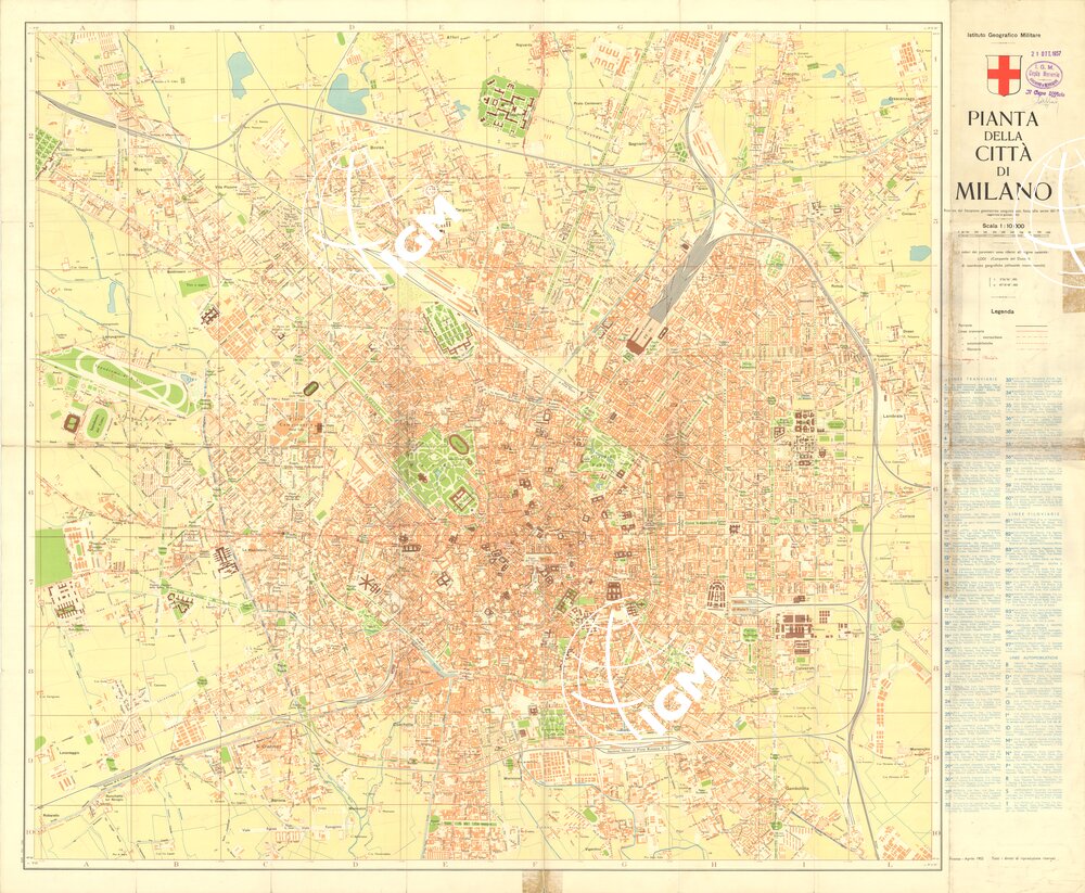Ricavata dal fotopiano geometrico eseguito con fotografie aeree del 1950. I valori dei parametri sono riferiti all’origine catastale: Lodi (Campanile del Duomo) di coordinate geografiche (ellissoide internazionale). La pianta fu disegnata su copirite ed iniziata nell’Ottobre del 1951 col disegno del fondo caseggiati e strade, colore base per gli altri che seguirono nell’ordine di lavoro: nero (ferrovie, toponimi e cornice), bistro (orografia e parametri), verde scuro (giardini e alberature), blu (acque), rosso (linee tranviarie e automobilistiche), verde chiaro (fondo campagne). Contemporaneamente al disegno, fu iniziata la stesura dei toponimi da inviare in tipografia per la composizione e la stampa su carta americana. I nomi furono divisi per carattere e il carattere per corpi, mentre un ulteriore frazionamento si ebbe nella riproduzione per la stampa delle copie fotografiche. Il lavoro di disegno e di revisione fu terminato nell’Aprile del 1952. E’ allegato un indice toponomastico delle: Vie, Viali, Corsi, Piazze, Piazzali, Larghi, Bastioni, Porte, Edifici Pubblici e Chiese. Annesso libretto