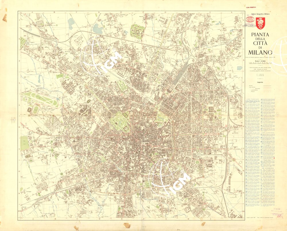 Ricavata dal fotopiano geometrico eseguito con fotografie aeree del 1950. I valori dei parametri sono riferiti all’origine catastale: Lodi (Campanile del Duomo) di coordinate geografiche (ellissoide internazionale). La pianta fu disegnata su copirite ed iniziata nell’Ottobre del 1951 col disegno del fondo caseggiati e strade, colore base per gli altri che seguirono nell’ordine di lavoro: nero (ferrovie, toponimi e cornice), bistro (orografia e parametri), verde scuro (giardini e alberature), blu (acque), rosso (linee tranviarie e automobilistiche), verde chiaro (fondo campagne). Contemporaneamente al disegno, fu iniziata la stesura dei toponimi da inviare in tipografia per la composizione e la stampa su carta americana. I nomi furono divisi per carattere e il carattere per corpi, mentre un ulteriore frazionamento si ebbe nella riproduzione per la stampa delle copie fotografiche. Il lavoro di disegno e di revisione fu terminato nell’Aprile del 1952. E’ allegato un indice toponomastico delle: Vie, Viali, Corsi, Piazze, Piazzali, Larghi, Bastioni, Porte, Edifici Pubblici e Chiese. Con velina.