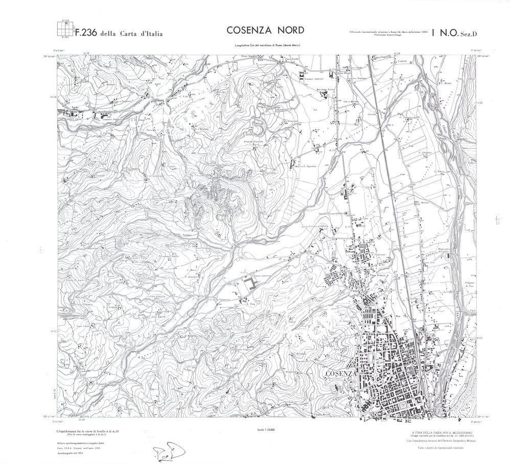Rilievo eseguito da ditte private a cura della Cassa per il Mezzogiorno (legge speciale per la Calabria 26/11/1955 n°1177) con l’assistenza tecnica dell’ I.G.M. Rilievo aereofotogrammetrico,proiezione naturale,stampa in nero,equidistanza tra le curve mt.10. Le fotoriprese aeree furono eseguite nel 1954, l’elemento cartografico era la sezione di tavoletta, ossia 1/4 di tavoletta, distinta dalle lettere A;B;C;D.