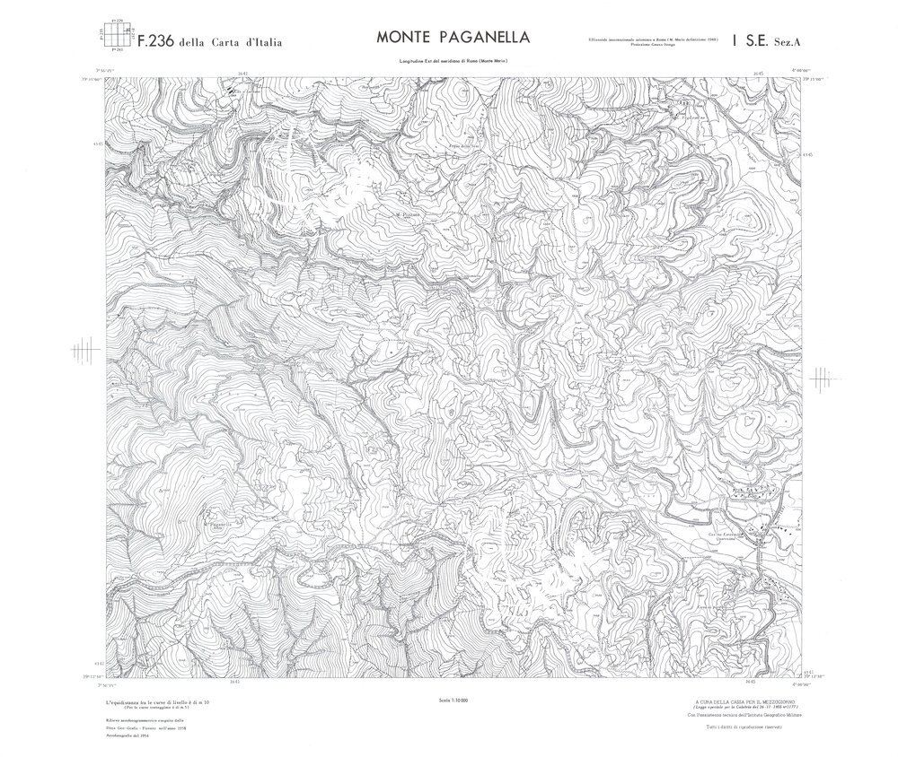 Rilievo eseguito da ditte private a cura della Cassa per il Mezzogiorno (legge speciale per la Calabria 26/11/1955 n°1177) con l’assistenza tecnica dell’ I.G.M. Rilievo aereofotogrammetrico,proiezione naturale,stampa in nero,equidistanza tra le curve mt.10. Le fotoriprese aeree furono eseguite nel 1954, l’elemento cartografico era la sezione di tavoletta, ossia 1/4 di tavoletta, distinta dalle lettere A;B;C;D.